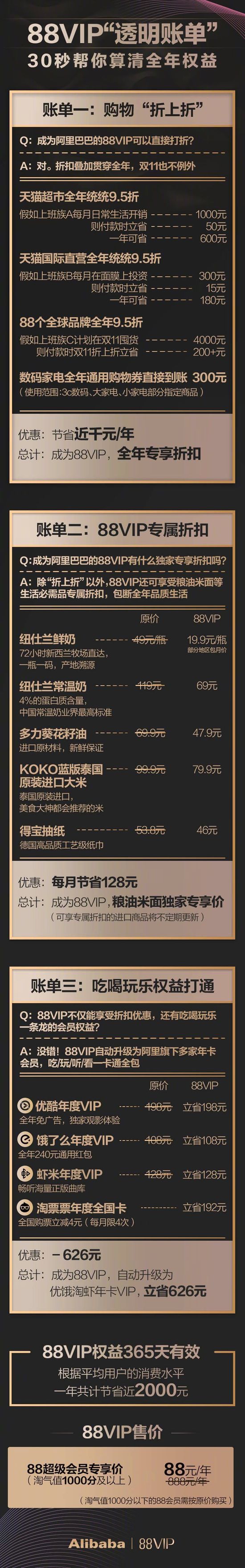 阿里巴巴集团首席市场官董本洪揭晓神秘的“88VIP”会员计划:成为“88VIP”之后,不仅可享天猫超市、天猫国际直营、全球88个品牌的优质商品统统全年9.5折,更让人注意的是,加入“88VIP”会员,自动升级优酷、饿了么、虾米、淘票票在内的年卡会员。完全打通阿里旗下四大企业内部会员。