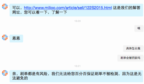 在与米粒网客服的对话中,第一财经记者假扮需要刷单的商家,当记者问及米粒网是否还在做刷单业务时,他表示还在做。而当记者问及刷单行为被发现时是否被罚的时候,他表示,刷单都是有风险,平台无法保证刷单不被检测到。