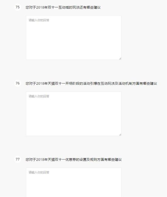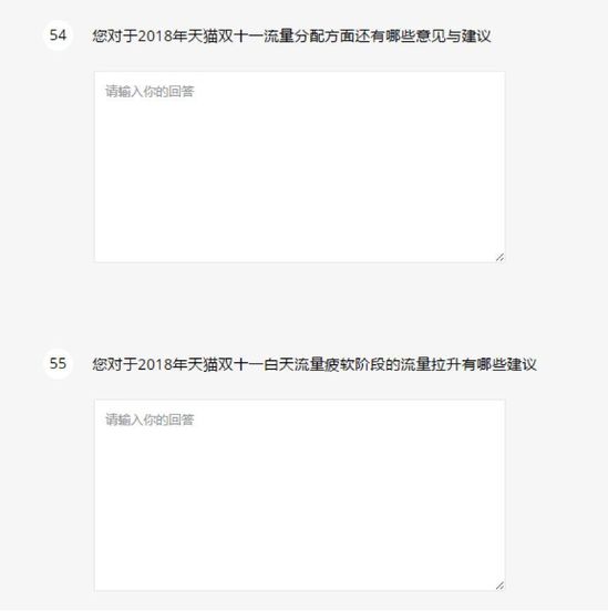 值得注意的是,调研问卷中直接设置了“对于2018年天猫双11白天流量疲软阶段的流量拉升有哪些建议”这样的问题。