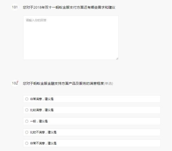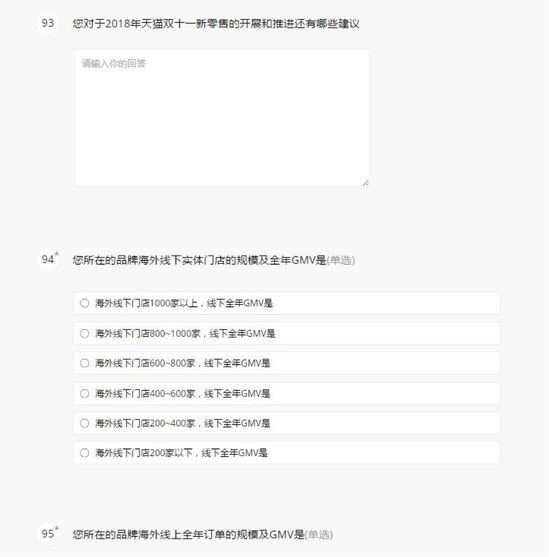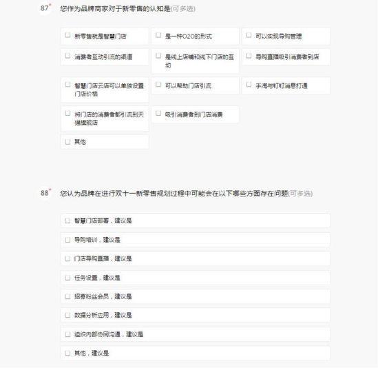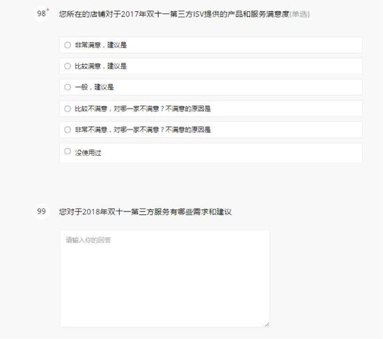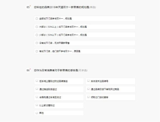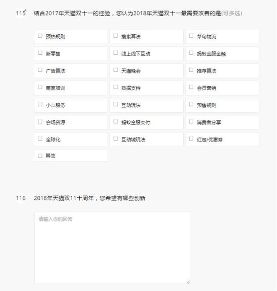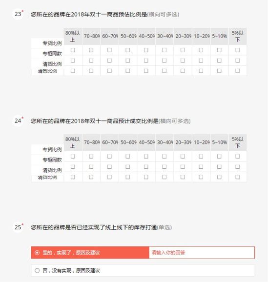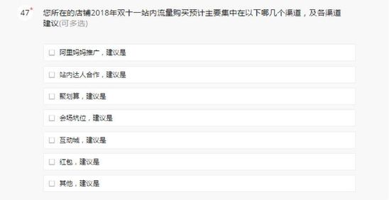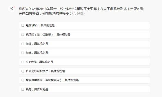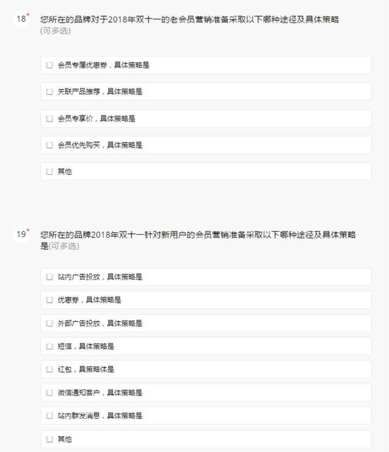 以下为【智囊团】2018天猫双11商家调研问卷的部分问题截图: