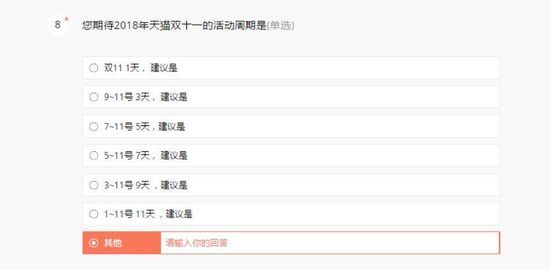 在调研问卷中,天猫公开征求了商家对于双11活动周期的建议。从该问题的选项中可见,天猫提供了“1天”“3天”“5天”“7天”“9天”“11天”和“其他”七个选项,目前尚不得知问卷调查的结果。