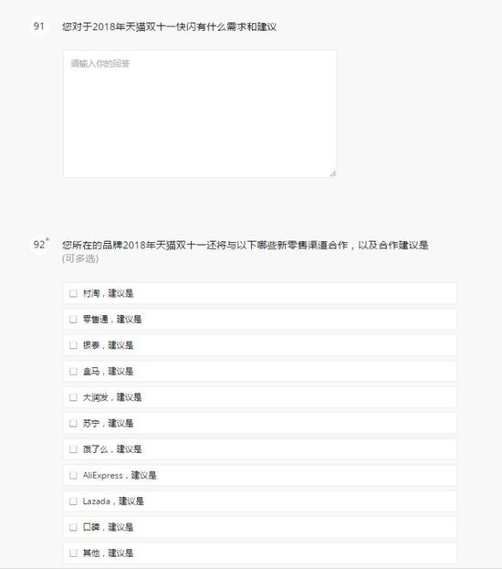 “这么详细的调研,在我印象中这是第一次。”一份收到了问卷的爆料商家说道,不少题目下,商家完成选择后还需要附上建议和原因。