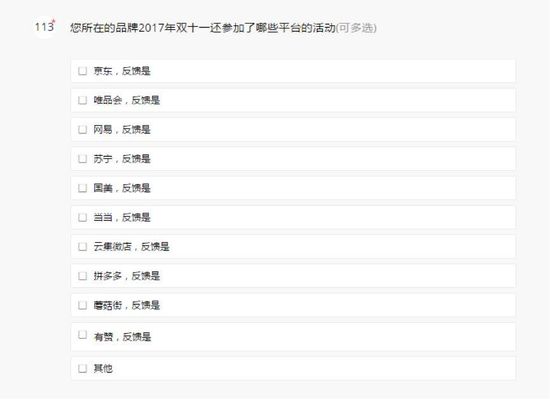 有趣的是,在这份调查问卷中,天猫直接设置了“是否在去年参加了其他平台的双11促销活动”,以及今年的选择情况等问题。在这道问题的选项中,除了京东、唯品会、网易、苏宁、当当和国美等电商平台外,刚刚在纳斯达克敲钟上市的拼多多、在香港借壳上市的有赞、腾讯生态中的蘑菇街以及迅速成长的云集微店都赫然在列。
