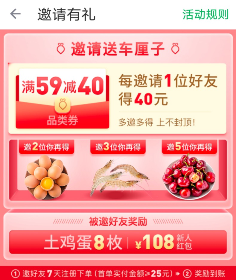 此外,还有消费者质疑叮咚买菜有虚假宣传之嫌。据叮咚买菜APP上宣传显示,用户每邀请一位好友得【满59-40】券,多邀多得,上不封顶。邀请成功后,系统将在48小时内审核并发放奖励。但据用户描述,该满减券并不能正常使用,系统还一直提示“账号存在风险,无法支付”,多次尝试无果,联系客服也无法解决。