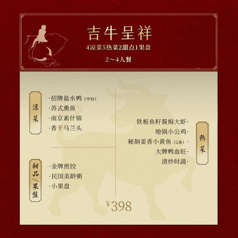 尤为值得关注的是,今年诸多商家考虑到留守本地的消费者需求,因地制宜推出了年夜饭小份套餐和半成品套餐,其中不乏多家知名连锁品牌和餐饮老字号。例如大龙燚火锅推出了多款百元左右的火锅单人套餐,南京大牌档推出了2至4人份的小套餐,北京老字号紫光园则推出了全新定制的牛年套餐。