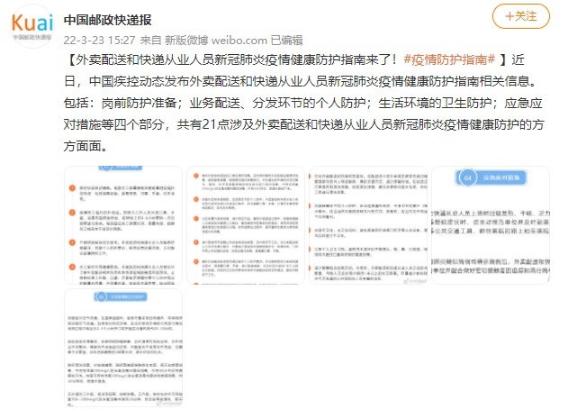 值得一提的是,近日,中国疾控动态发布外卖配送和快递从业人员新冠肺炎疫情健康防护指南。包括岗前防护准备;业务配送、分发环节的个人防护;生活环境的卫生防护;应急应对措施四个部分,共有21点涉及外卖配送和快递从业人员新冠肺炎疫情健康防护的方方面面。