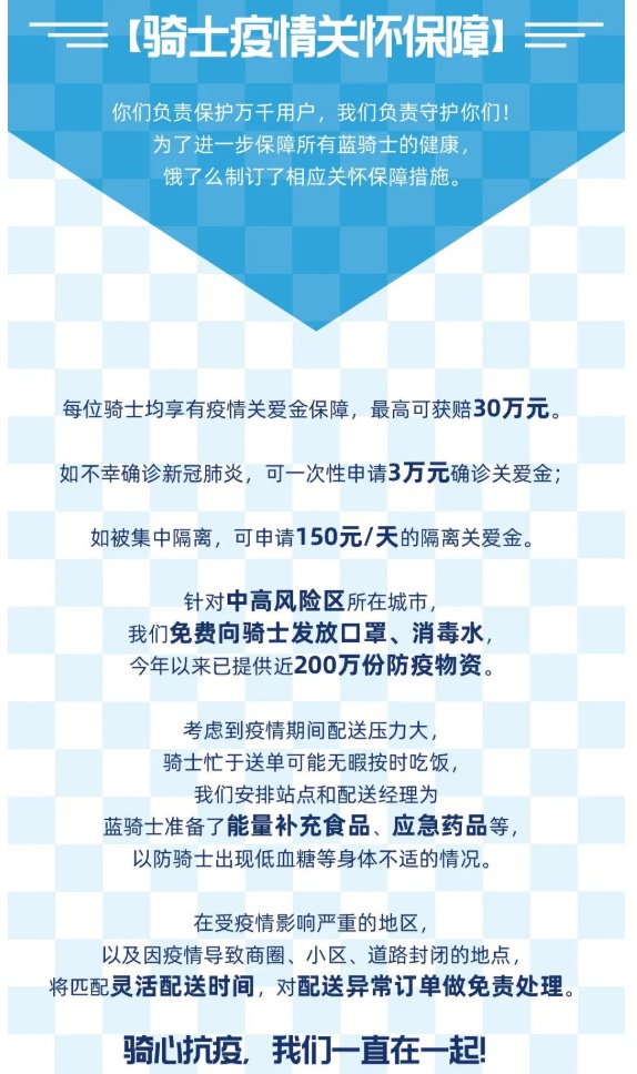 据介绍,样的爱心补给站目前已经在全国11座城市落地,饿了么称还将继续覆盖更多地区。同时,饿了么也推出多项举措为蓝骑士提供抗疫保障。每位骑士均享有疫情关爱金保障,最高30万元。如不幸确诊新冠肺炎,可申请3万元确诊关爱金;如被集中隔离,可申请每天150元隔离关爱金。相关费用均由饿了么承担。