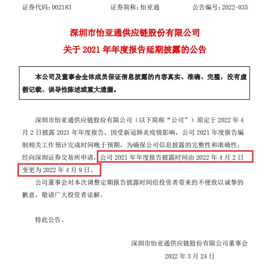 3月25日消息,深圳市怡亚通供应链股份有限公司3月24日发布关于2021年年度报告延期披露的公告(以下简称公告)。