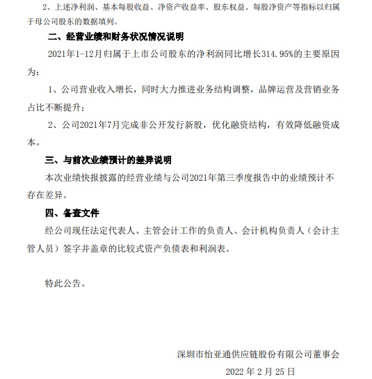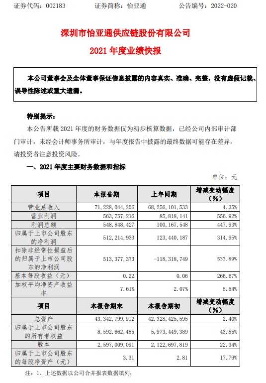 此前,怡亚通曾在今年2月发布2021年度业绩快报。快报显示,怡亚通2021年营收712.28亿元,同比增长4.35%;归属于上市公司股东的净利润5.12亿元,同比增长314.95%;扣除非经常性损益后的归属于上市公司股东的净利润5.13亿元,同比增长533.89%。