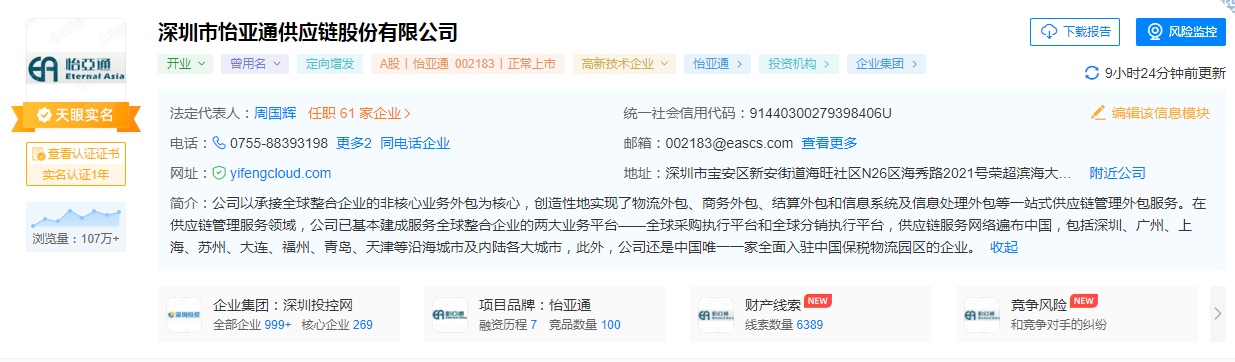 天眼查资料显示,怡亚通以承接全球整合企业的非核心业务外包为核心,创造性地实现了物流外包、商务外包、结算外包和信息系统及信息处理外包等一站式供应链管理外包服务。