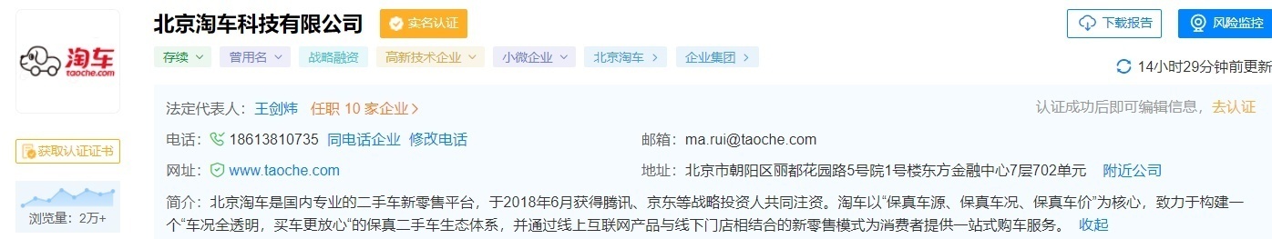 天眼查资料显示,淘车是国内二手车新零售平台,于2018年6月获得腾讯、京东等战略投资人共同注资。淘车通过线上互联网产品与线下门店相结合的新零售模式为消费者提供一站式购车服务。