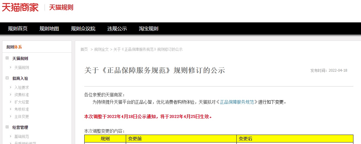 公告称,为持续提升天猫平台的正品心智,优化消费者购物体验,天猫拟对《正品保障服务规范》进行如下变更。本次调整于2022年4月18日公示通知,将于2022年4月25日生效。