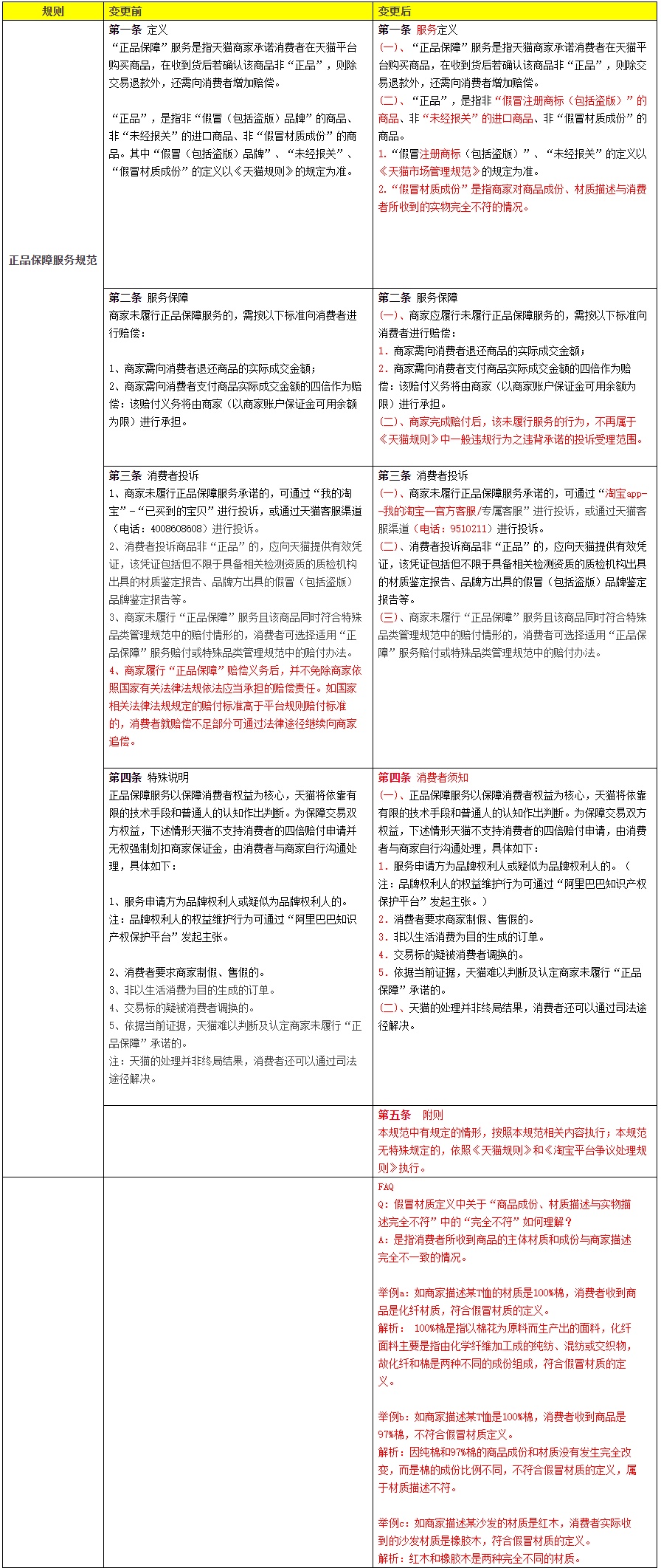 公告显示,变更后,服务定义方面,“正品保障”服务是指天猫商家承诺消费者在天猫平台购买商品,在收到货后若确认该商品非“正品”,则除交易退款外,还需向消费者增加赔偿。“正品”,是指非“假冒注册商标(包括盗版)”的商品、非“未经报关”的进口商品、非“假冒材质成份”的商品。“假冒注册商标(包括盗版)”、“未经报关”的定义以《天猫市场管理规范》的规定为准。“假冒材质成份”是指商家对商品成份、材质描述与消费者所收到的实物完全不符的情况。