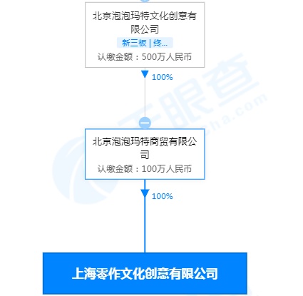 股权穿透图显示,该公司由北京泡泡玛特商贸有限公司全资持股,后者由北京泡泡玛特文化创意有限公司全资控股。