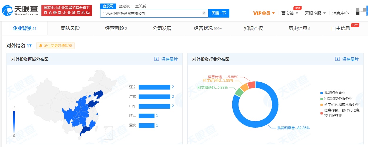 据天眼查不完信息统计,成立至今,该公司已对外投资成立17家公司,遍布辽宁、广东、山东、陕西、重庆等地,包括青岛泡泡玛特贸易有限公司、深圳泡泡玛特贸易有限公司、重庆葩趣贸易有限公司、成都泡泡玛特贸易有限公司等。