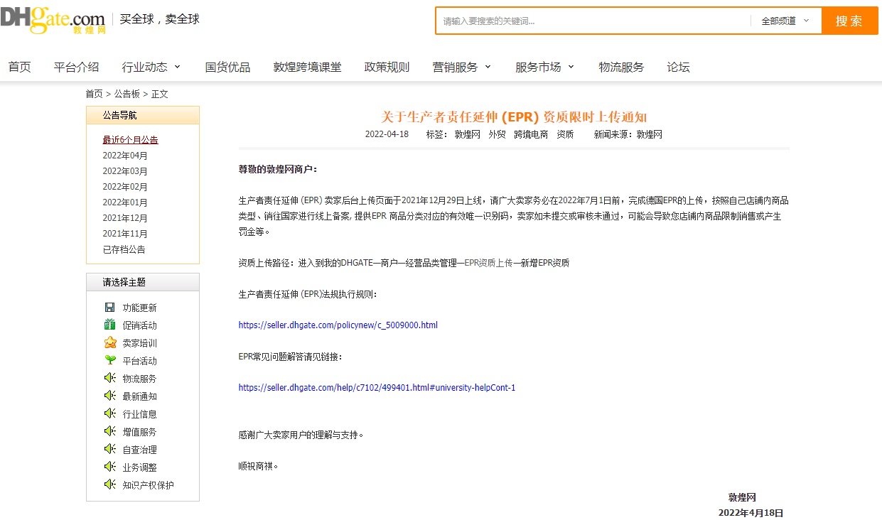 公告显示,资质上传路径:进入到我的DHGATE—商户—经营品类管理—EPR资质上传—新增EPR资质。