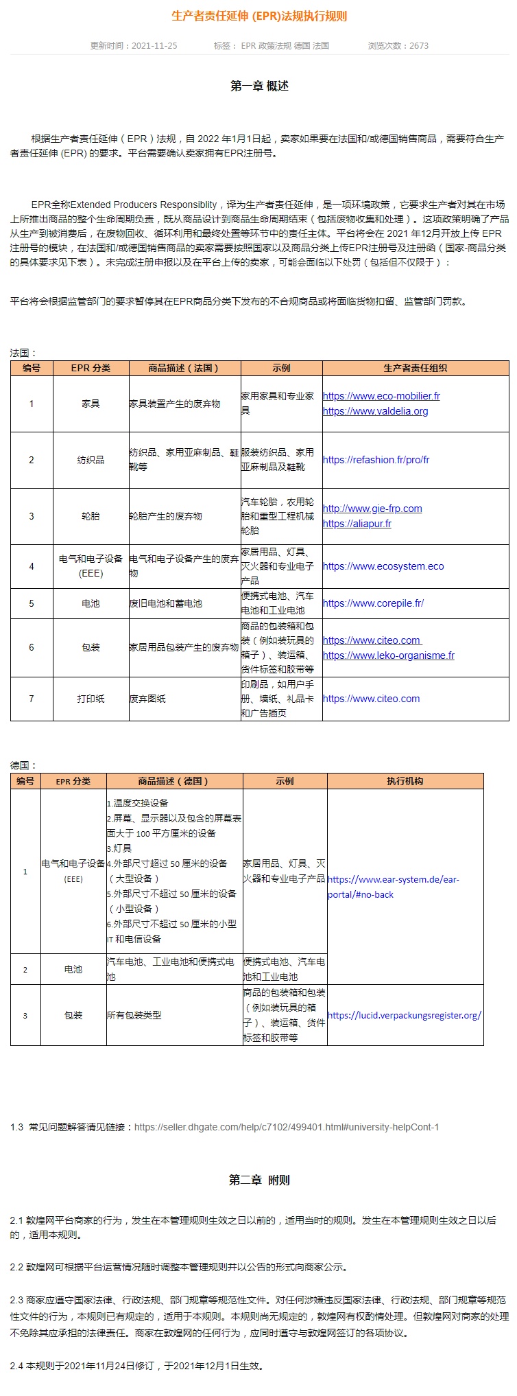 生产者责任延伸(EPR)法规执行规则显示,根据生产者责任延伸(EPR)法规,自2022年1月1日起,卖家如果要在法国和/或德国销售商品,需要符合生产者责任延伸(EPR)的要求。平台需要确认卖家拥有EPR注册号。