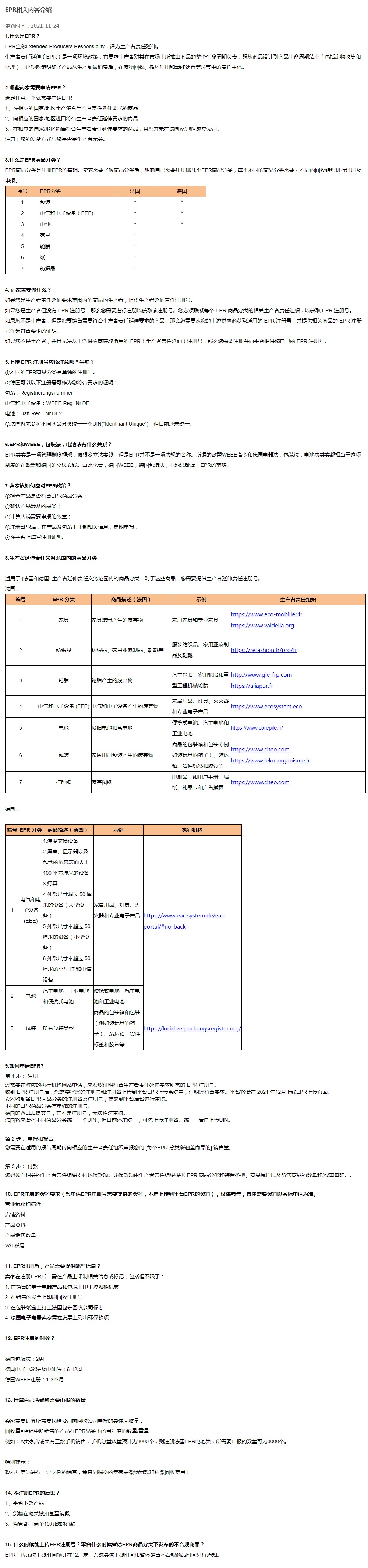 EPR全称Extended Producers Responsiblity,译为生产者责任延伸,是一项环境政策,它要求生产者对其在市场上所推出商品的整个生命周期负责,既从商品设计到商品生命周期结束(包括废物收集和处理)。这项政策明确了产品从生产到被消费后,在废物回收、循环利用和最终处置等环节中的责任主体。平台将会在2021年12月开放上传EPR注册号的模块,在法国和/或德国销售商品的卖家需要按照国家以及商品分类上传EPR注册号及注册函。未完成注册申报以及在平台上传的卖家,可能会面临以下处罚(包括但不仅限于):平台将会根据监管部门的要求暂停其在EPR商品分类下发布的不合规商品或将面临货物扣留、监管部门罚款。