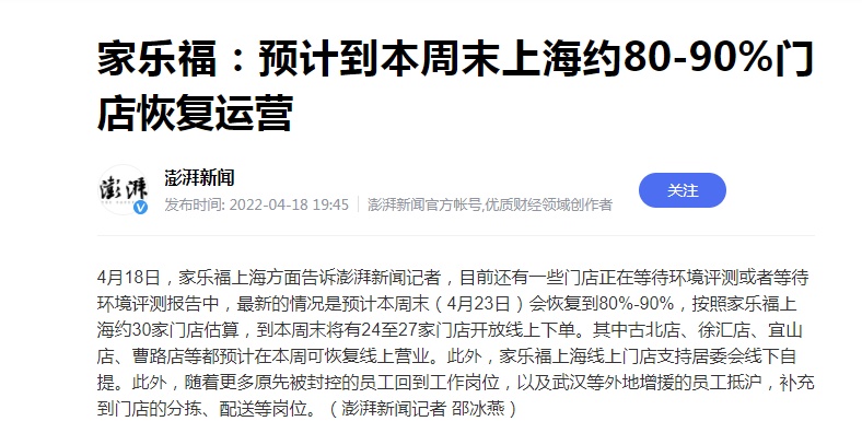 家乐福:预计到本周末上海约80-90%门店恢复运营