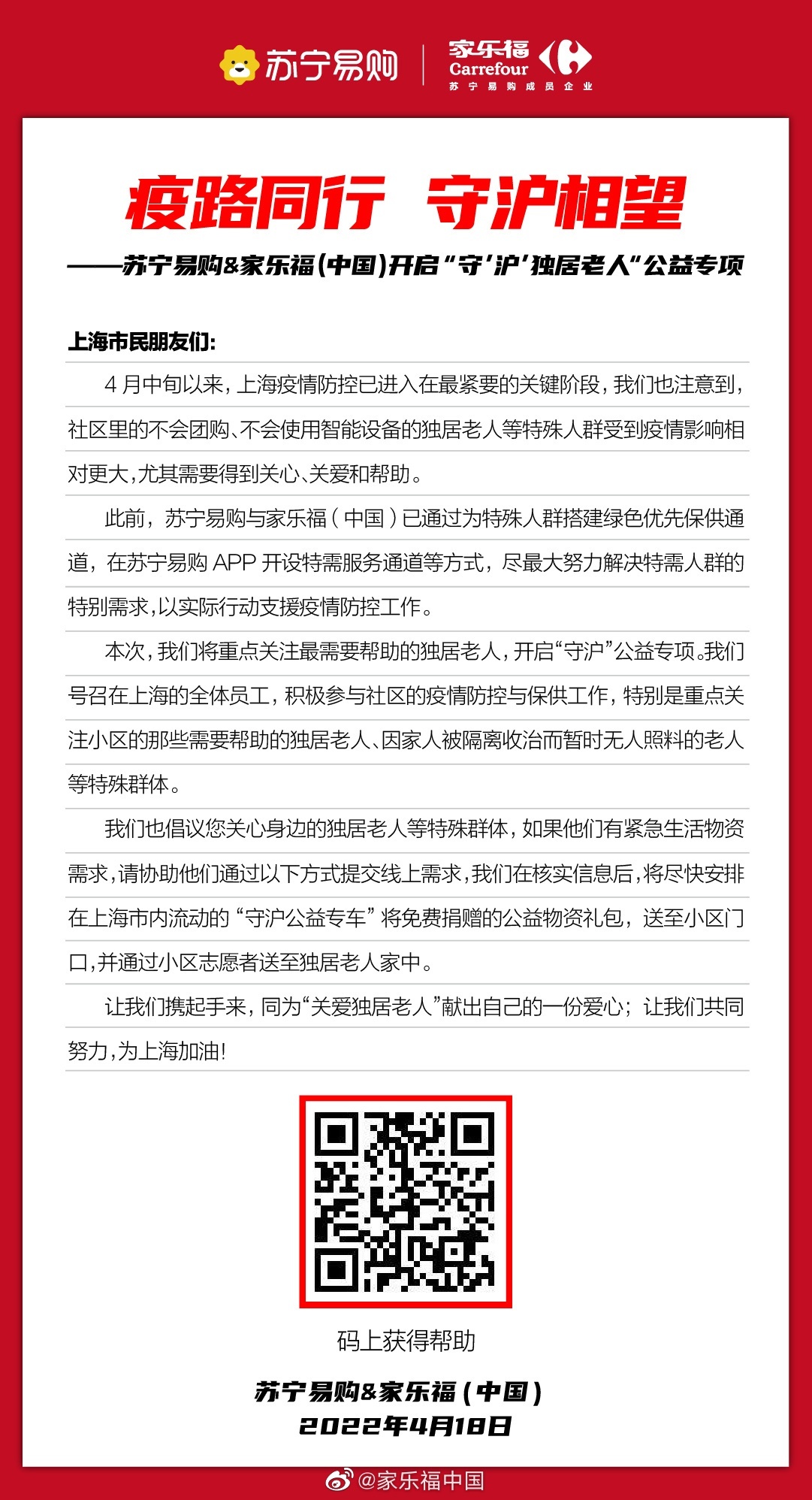 据悉,今日,苏宁易购&家乐福(中国)发起关爱独居老人“守沪公益”专项行动,通过官方渠道,倡议上海市民关注关心身边的独居老人等特殊群体,如果他们有紧急生活物资需求,可以协助老人通过以下方式提交线上需求,家乐福在核实相关信息后,将尽快安排在上海市内流动的“守沪公益专车”将免费捐赠的公益物资礼包,送至小区门口,并通过小区志愿者送至独居老人家中。