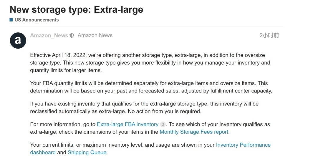 值得一提的是,亚马逊美国站和欧洲站今日也发布公告称,自4月18日起,除了超大型存储类型外,亚马逊还为卖家新推出另一种特大型储存类型,便于卖家管理库存和大型商品的数量限制。