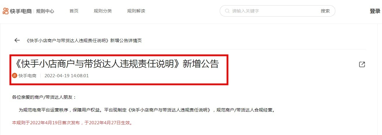 4月19日消息,为规范电商平台运营秩序,保障用户权益,今日,快手电商发布《快手小店商户与带货达人违规责任说明》新增公告。该规则于2022年4月19日首次发布,于2022年4月27日生效。