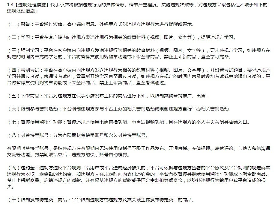 (上图为部分《快手小店营销违规管理规则》违规处理措施)