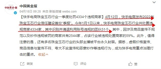 值得一提的是,此前,快手电商发布2022年珠宝玉石行业信任建设首份“季报”。今年以来快手电商珠宝玉石行业共有4334个违规商家被平台处罚,其中因商品宣传违规以及炒作卖货被罚的商家占比59%。此外,还有多名珠宝玉石行业的头部主播被平台永久封禁。