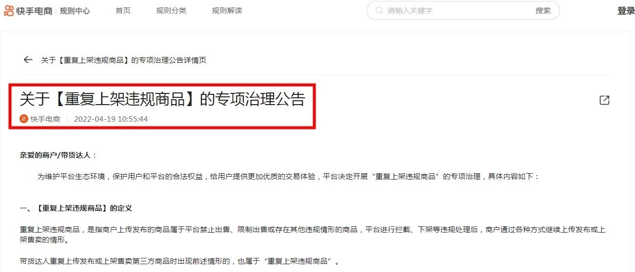 4月19日消息,今日,快手电商发布关于【重复上架违规商品】的专项治理公告。公告称,为维护平台生态环境,保护用户和平台的合法权益,给用户提供更加优质的交易体验,平台决定开展“重复上架违规商品”的专项治理。