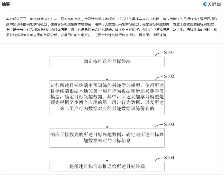 该专利摘要显示,本发明公开了一种信息推送的方法、服务端和系统,涉及计算机技术领域。该方法的具体实施方式包括:确定待推送的目标终端;运行目标终端中预训练的兴趣学习模型,使得目标终端根据本地的第一用户行为数据和兴趣学习模型,确定目标兴趣数据;响应于接收到的目标兴趣数据,确定与目标兴趣数据相对的目标信息;将目标信息推送给目标终端。