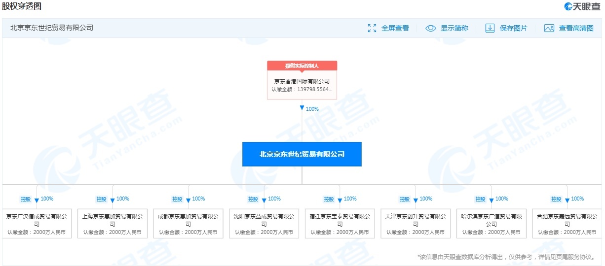 股权穿透图显示,北京京东世纪贸易有限公司由京东香港国际有限公司100%全资持股,认缴金额为139798.5564万美元。