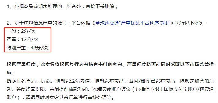 商品管控规则上,违规商品逾期未处理的一经查处,直接下架删除;对于违规情况严重的账号,平台依据《全球速卖通“严重扰乱平台秩序”规则》执行处罚,一般记2分/次,严重记12分/次,特别严重记48分/次。