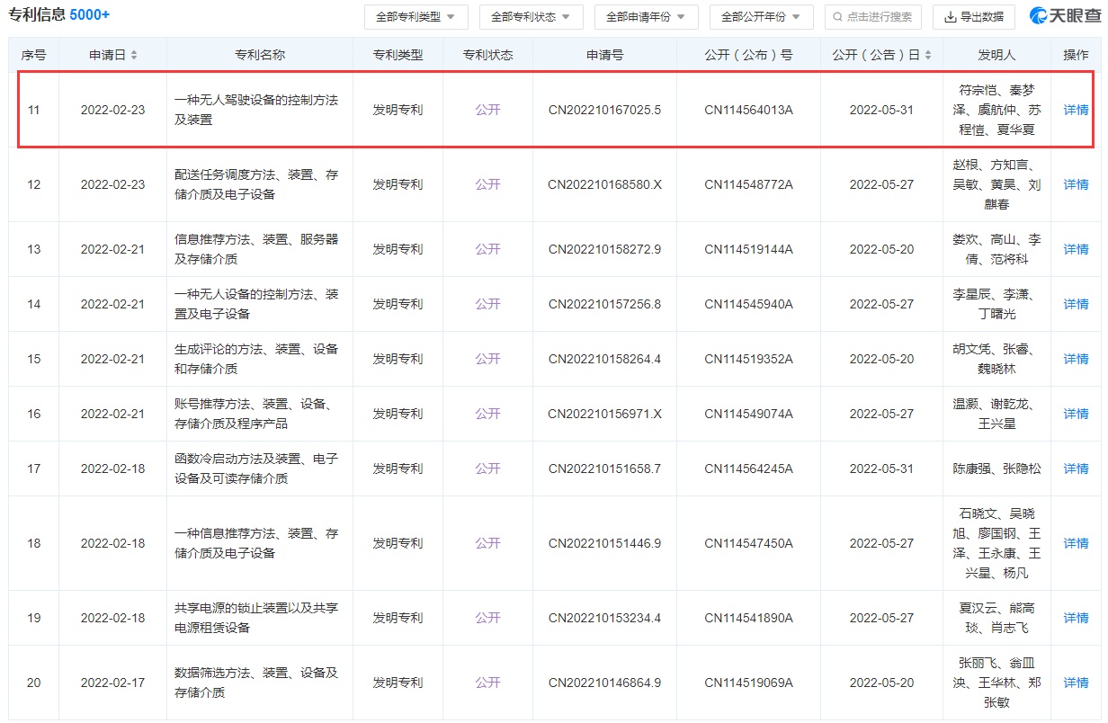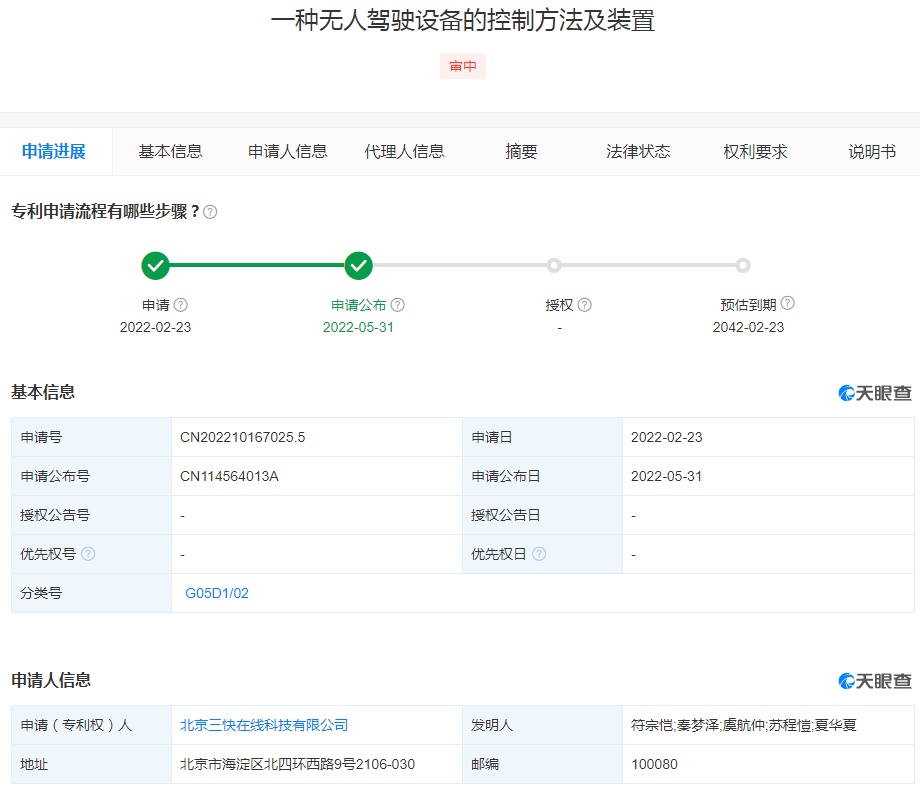 6月2日消息,天眼查资料显示,美团关联公司北京三快在线科技有限公司5月31日公开一项“一种无人驾驶设备的控制方法及装置”专利,申请公布号为CN114564013A,申请日期为2022年2月23日。