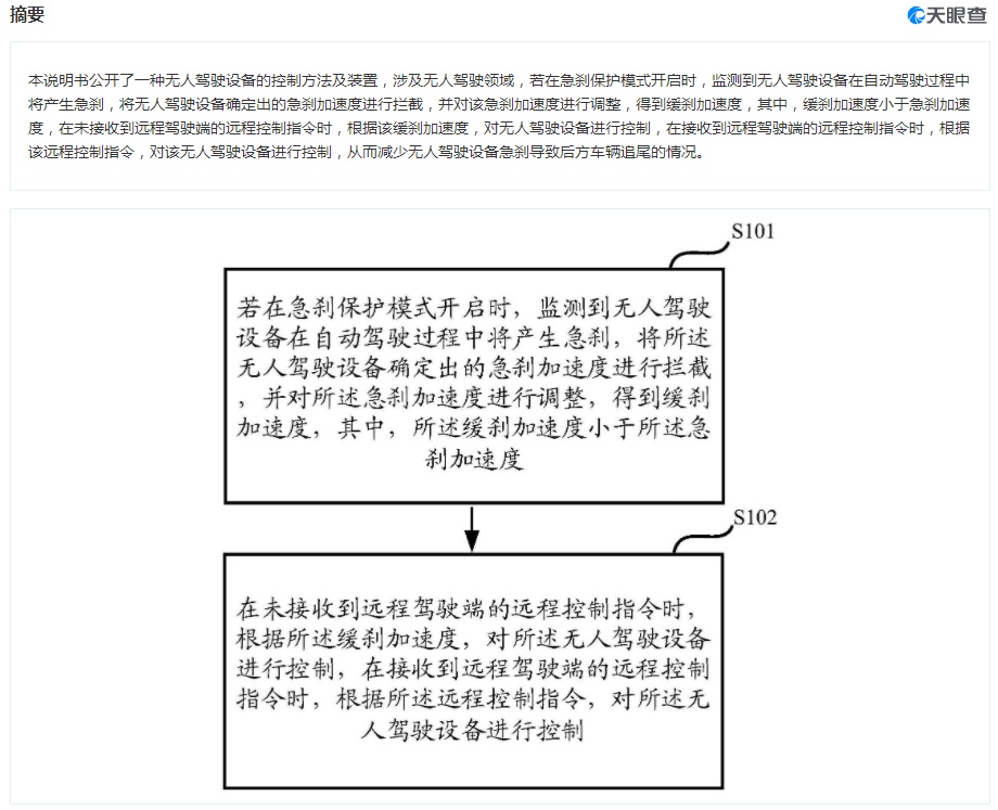 该专利摘要显示,本说明书公开了一种无人驾驶设备的控制方法及装置,涉及无人驾驶领域,若在急刹保护模式开启时,监测到无人驾驶设备在自动驾驶过程中将产生急刹,将无人驾驶设备确定出的急刹加速度进行拦截,并对该急刹加速度进行调整,得到缓刹加速度,其中,缓刹加速度小于急刹加速度,在未接收到远程驾驶端的远程控制指令时,根据该缓刹加速度,对无人驾驶设备进行控制,在接收到远程驾驶端的远程控制指令时,根据该远程控制指令,对该无人驾驶设备进行控制,从而减少无人驾驶设备急刹导致后方车辆追尾的情况。