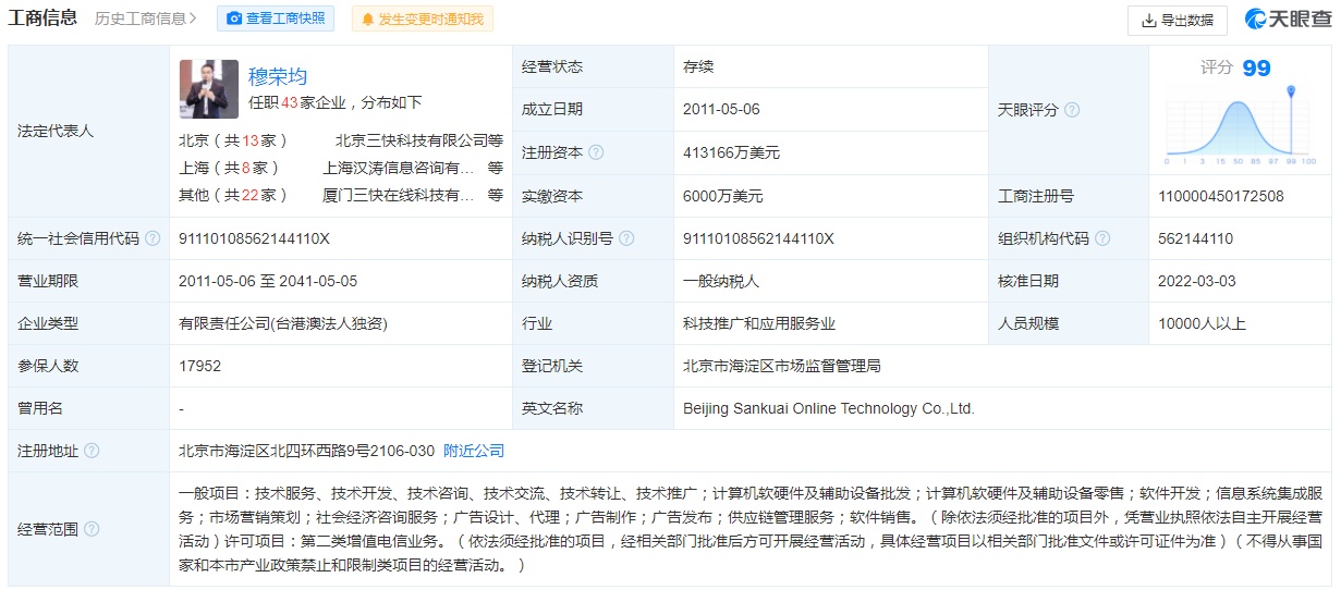 天眼查资料显示,北京三快在线科技有限公司成立于2011年5月,注册资本413166万美元,法定代表人为穆荣均,公司经营范围包括计算机软件技术、网络技术开发;技术转让、技术服务、技术咨询;计算机系统集成;企业营销策划;经济贸易咨询;销售自行开发的软件产品;批发计算机硬件及其配套设备;基础软件服务;应用软件服务;设计、制作、代理、发布广告;供应链管理。