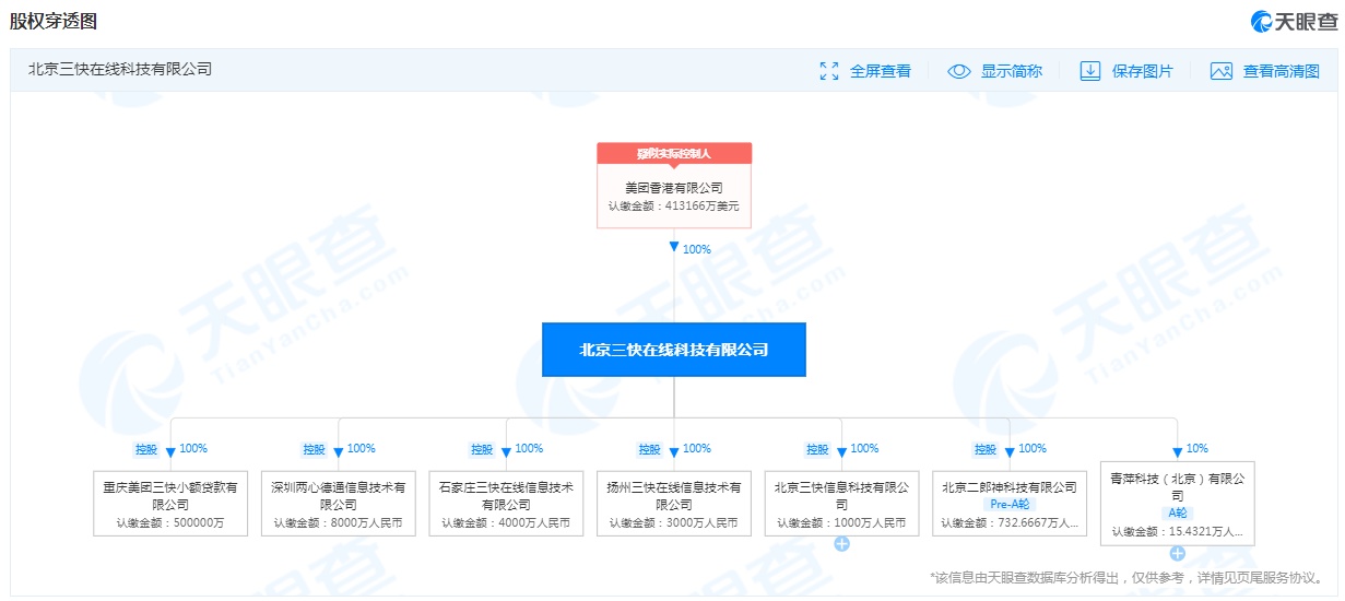 股权穿透图显示,北京三快在线科技有限公司由美团香港有限公司(Meituan HK Limited)100%全资持股,认缴金额为413166万美元。