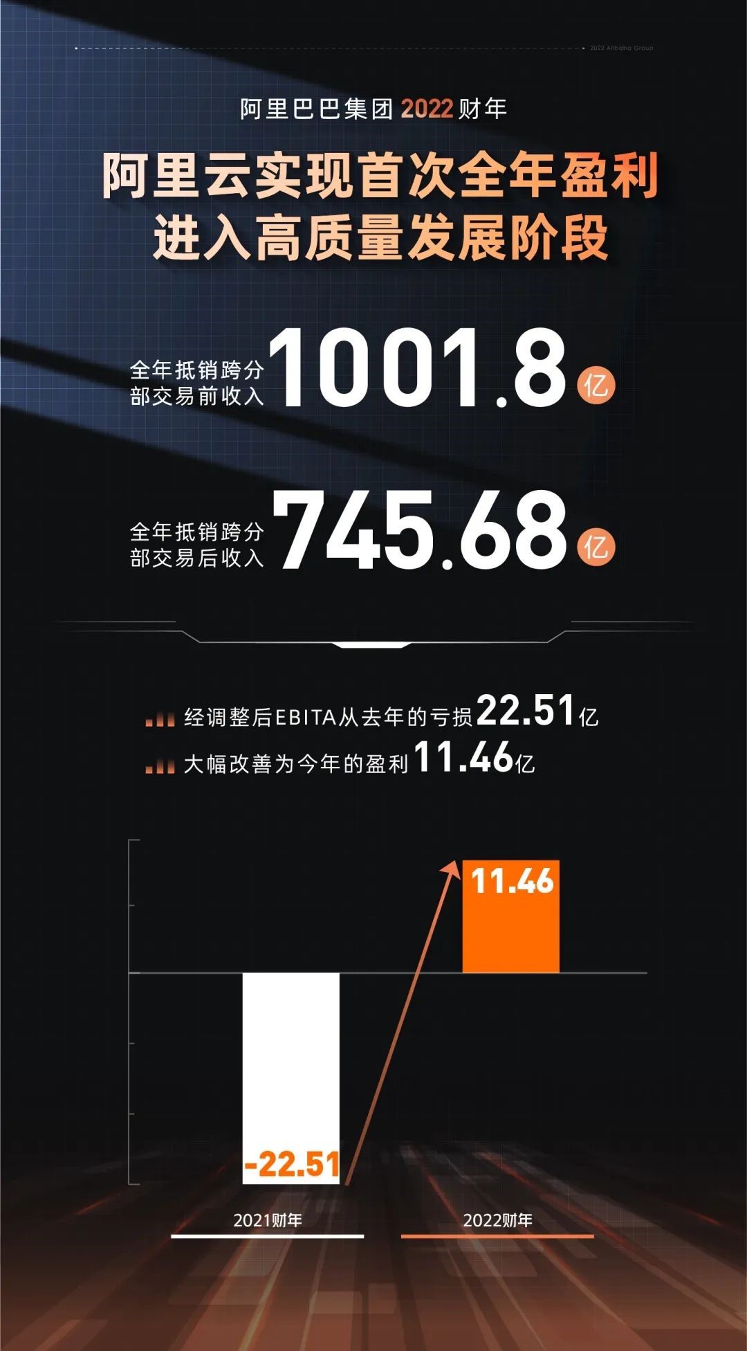 具体来说,阿里云全年收入在抵销跨分部交易前和抵销后分别为1001.8亿元和745.68亿元,并且实现11.46亿的盈利数据,凭借这一数据,阿里云业务正式成为除中国商业分部之外,阿里舰队的第二支柱。