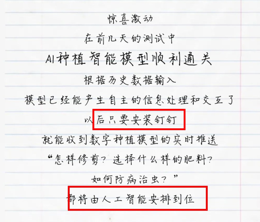 比如在去年12月,阿里云研发的砀山酥梨数字种植模型,就实现了结合农业知识图谱和物联网数据,再将具体的农事操作推送到钉钉上的功能。在钉钉的指导下,即使是完全没种过地的城里人,也能按照APP实时要求,种出可口的酥梨。