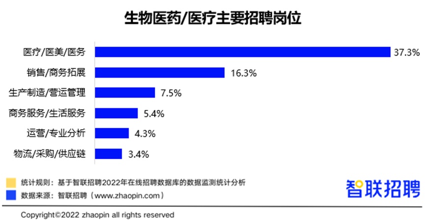 在生物医药/医疗领域,专业性医疗类岗位的招聘需求最高,其次是销售、制造、运营、供应链等职位,行政、人事等职能性岗位需求占比不到3成。