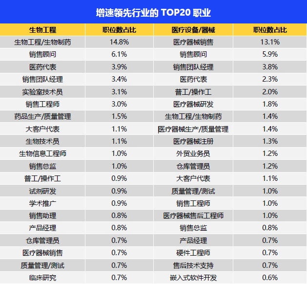生物工程行业职位需求占比第一的是生物工程/生物制药,占比达到14.8%。医疗设备/器械的职位需求占比排名第一的是医疗器械销售(13.1%)。此外,销售顾问、医药代表、销售团队经理等销售型岗位在两个行业中均排在前列,一定程度反映出行业内各企业在市场上的快速扩张势头。