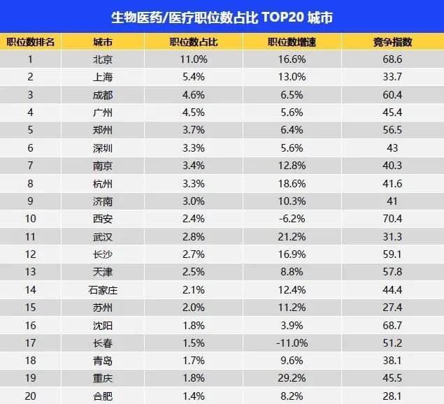 从城市维度看,在生物医药/医疗职位数占比排名TOP20的城市中,北京职位数最多,占比达到11%,其次是上海(5.4%),成都超过广州和深圳,以4.6%的占比位列第三。但从竞争指数来看,上海的竞争指数为33.7,明显小于北京和成都的68.6、60.4。