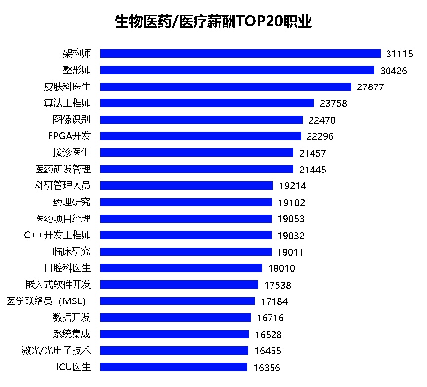 生物医药/医疗薪酬TOP20职业中,平均招聘薪资排名第一的架构师,月收入达31115元/月,其次是整形师(30426元)、皮肤科医生(27877元)、算法工程师(23758元)。从上榜职业来看,高技术型岗位平均招聘薪酬更高。
