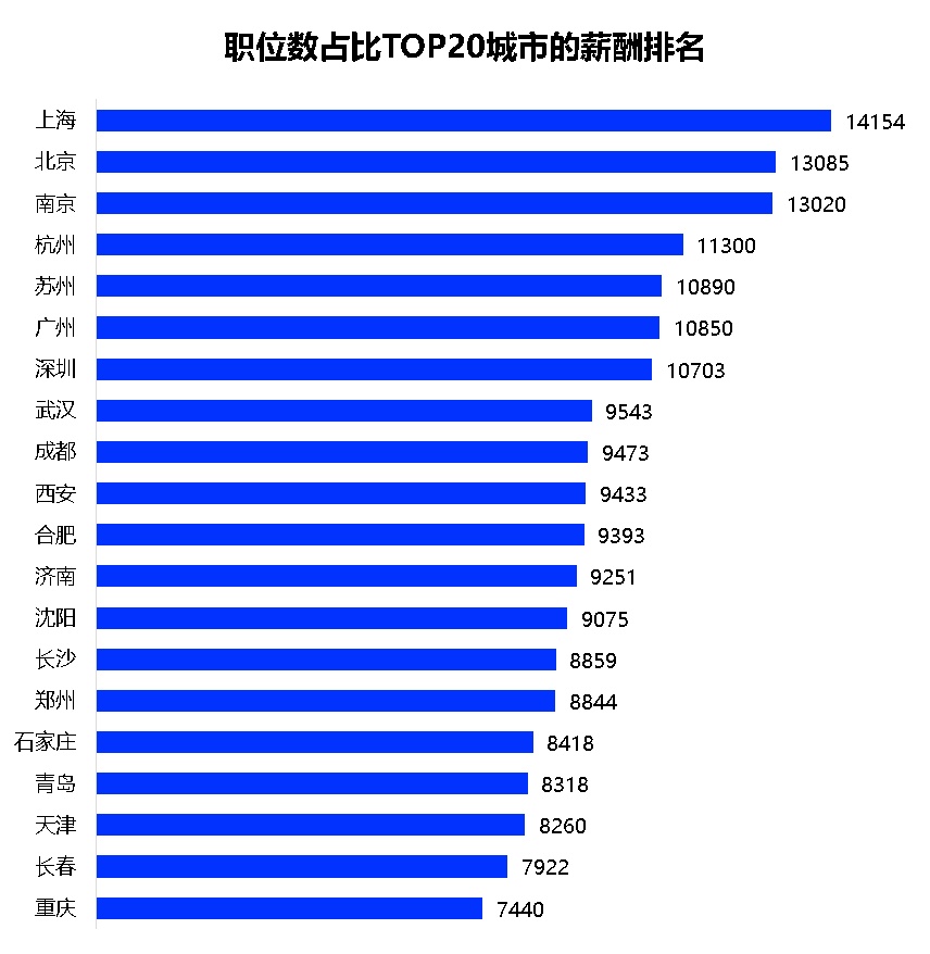 职位数占比TOP20的城市中,重庆职位数增速位居第一,达到29.2%。其次是武汉和杭州,职位数增速分别为21.2%和18.6%。