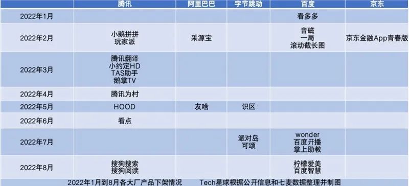 据Tech星球统计,腾讯今年宣布下架的产品(含游戏类)已经接近40款,而各个互联网大厂也开启了APP的下架潮,大厂们今年下架的非游戏类产品已经超过20款。
