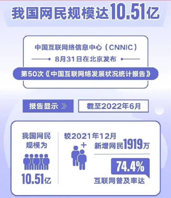 中国互联网信息中心发布的第50次《中国移动互联网发展状况统计报告》显示,截止至2022年6月,中国手机网民规模达到10.51亿人,和2021年12月相比,增加了1919万人,同比增速放缓,国内互联网用户规模日趋见顶。