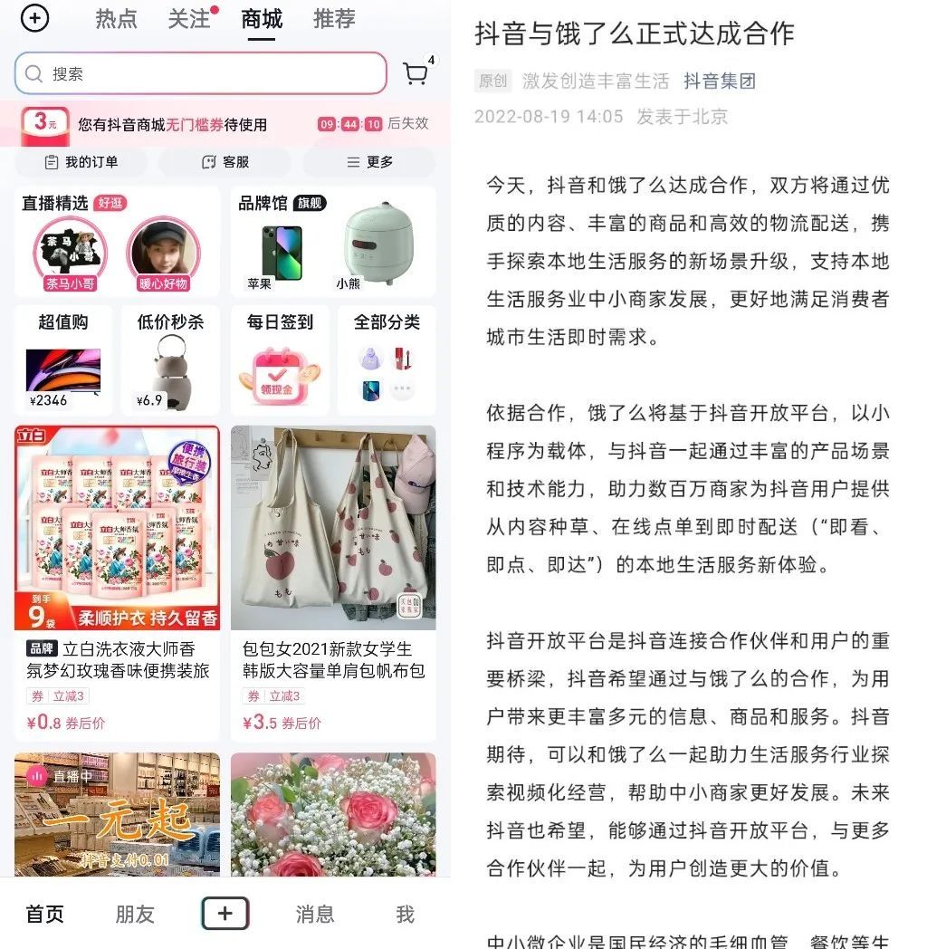 上个月15日,有消息传出抖音电商将进行业务调整,布局购物商城,深入发展货架电商;紧接着抖音和饿了么官宣合作,二者将携手探索本地生活服务的新场景升级,在视频化时代给消费者带来 " 即看、即点、即达 " 的本地生活新体验。