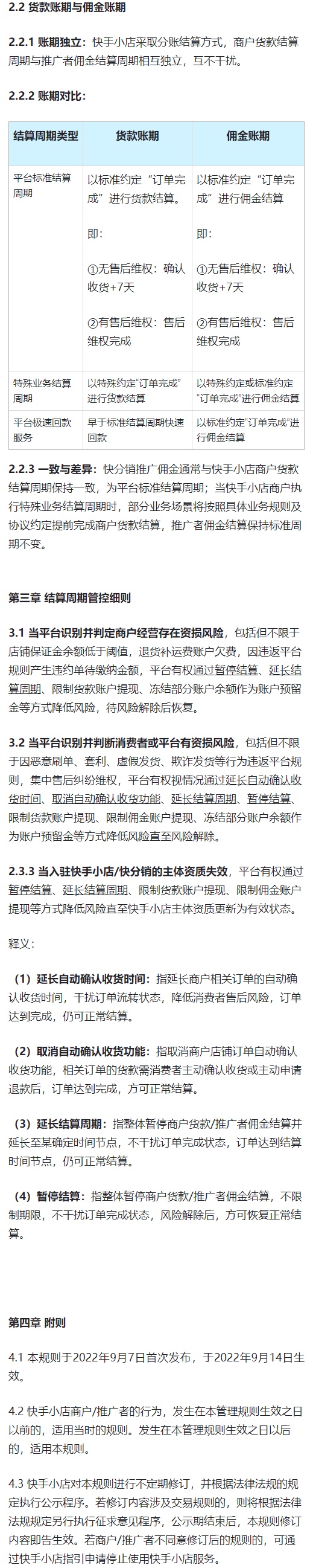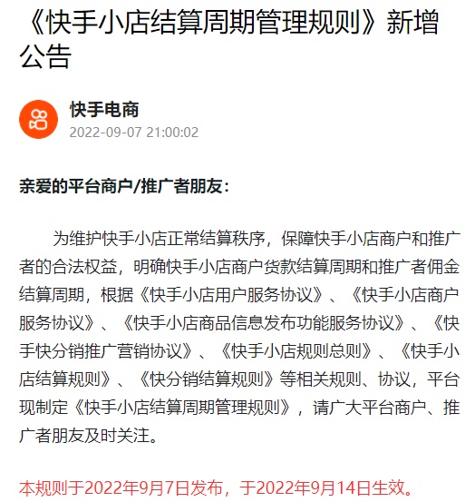 9月8日消息,快手电商发布公告称,为维护快手小店正常结算秩序,保障快手小店商户和推广者的合法权益,明确快手小店商户货款结算周期和推广者佣金结算周期,根据《快手小店用户服务协议》、《快手小店商户服务协议》等相关规则、协议,平台现制定《快手小店结算周期管理规则》,于2022年9月14日生效。