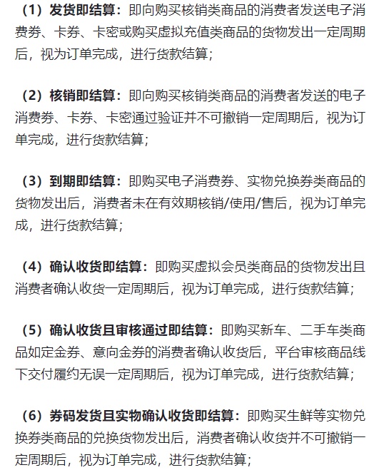 特殊业务如本地生活服务、虚拟卡券、实物兑换券、话费充值、电子会员、新车、二手车、拍卖、定金预售等,以及协议约定的其他结算周期,以具体业务规则及协议约定为准。包括但不限于:发货即结算、核销即结算、到期即结算、确认收货即结算、确认收货且审核通过即结算、券码发货且实物确认收货即结算。