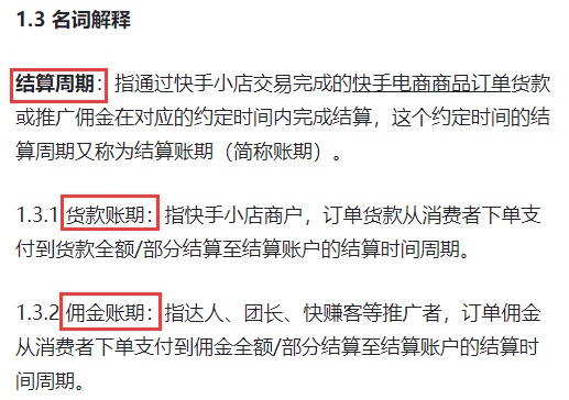 结算周期:指通过快手小店交易完成的快手电商商品订单货款或推广佣金在对应的约定时间内完成结算,这个约定时间的结算周期又称为结算账期(简称账期)。