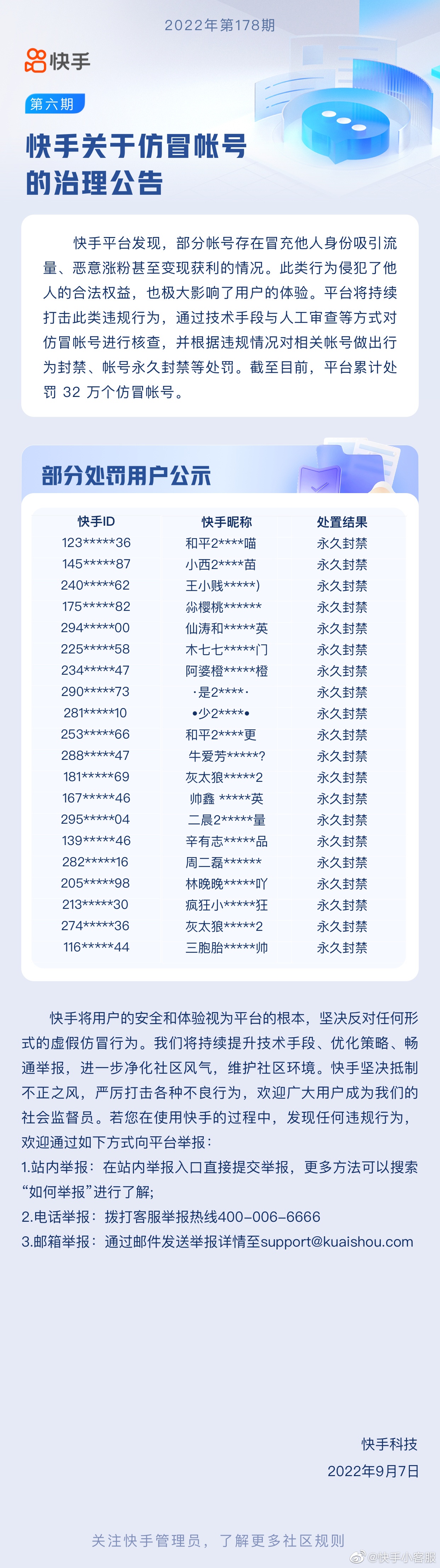 9月7日消息,快手小客服官博发布关于仿冒账号治理的公告(以下简称“公告”)。公告称,快手平台发现,部分帐号存在冒充他人身份吸引流量、恶意涨粉甚至变现获利的情况。此类行为侵犯了他人的合法权益,也极大影响了用户的体验。